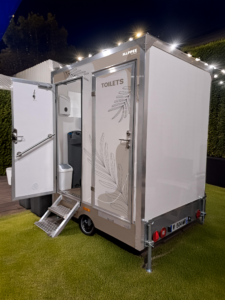 Among our flagship solutions, the Festi 10’ Sanitary Caravan stands out for its unique combination of autonomy, comfort and design. Manufactured in Northern France by SWITTEC, it features two autonomous toilets, a 148-litre waste tank and a 60-litre fresh water tank, as well as integrated heating and soft ambient lighting. Its modern interior, carefully designed with refined décor and lighting effects, creates a sophisticated and pleasant atmosphere for guests, while ensuring robustness and durability for repeated use.