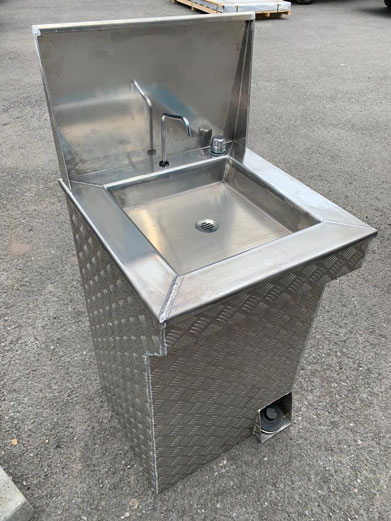 Hygiénique : Réservoir fermé. Fonctionne avec une pompe à pied. Eau non potable. Bac suffisamment large pour permettre le nettoyage des avant-bras