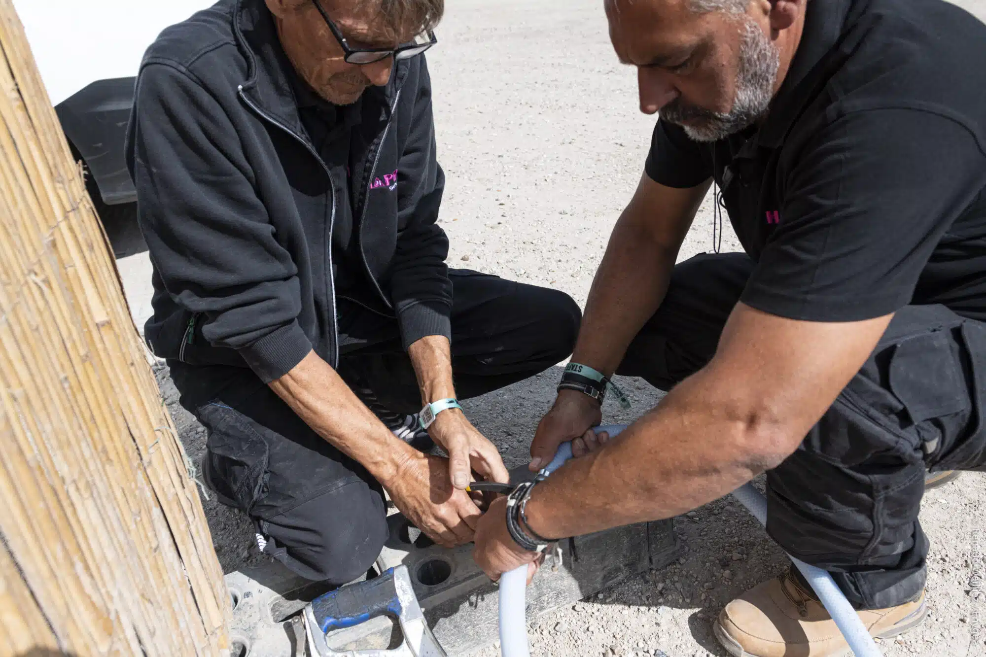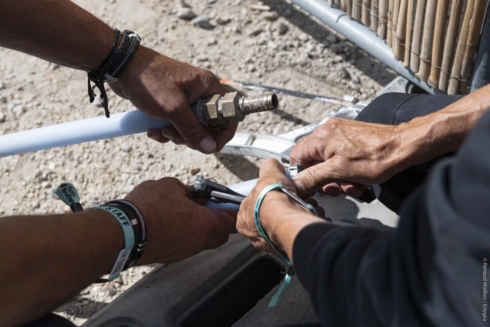 - Le tirage du réseau d’eau pour l’approvisionnement en eau claire des sanitaires (depuis un point d’eau existant ou via un raccordement temporaire).