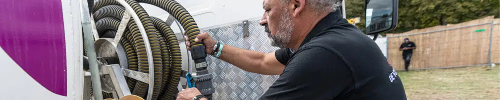 Nous utilisons des camions vidangeurs agréés et certifiés, capables de pomper les déchets des sanitaires et de les rediriger vers les centres de traitement agréés. Une partie de notre flotte est composée de véhicules « verts », afin de limiter l’empreinte carbone de nos opérations, notamment en milieu urbain ou sur les événements engagés dans une démarche écoresponsable.